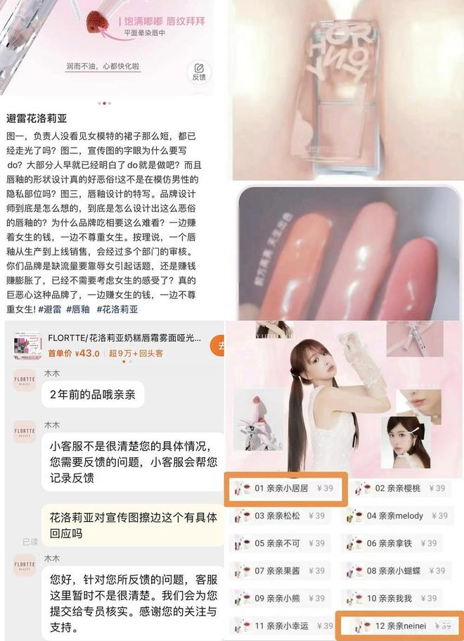 据蓝鲸新闻了解到的最新情况,花洛莉亚品牌下两款产品因不同原因卷入争议:一款是2021年11月推出的唇泥系列,其色号命名“亲亲小居居”“亲亲neinei”遭到公众质疑;另一款则是最近上市的唇蜜新品,因唇刷产品设计疑似男性生殖器引发争议。无独有偶,黑兔的一款双色提亮膏的广告图,也被指有性暗示的嫌疑。